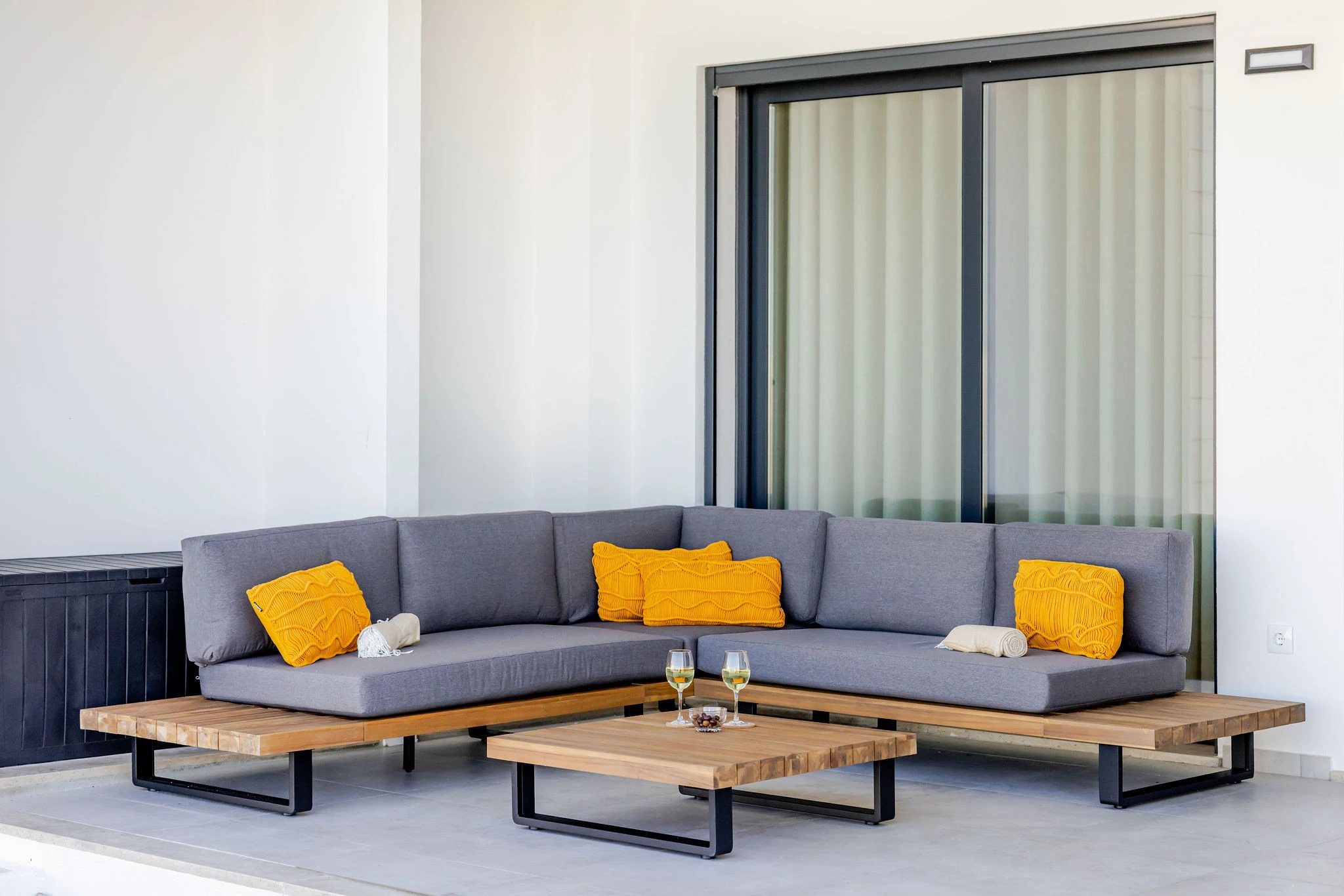 De woonkamer en de master slaapkamer liggen aan de achterzijde van het appartement en bieden uitzicht over het zwembad richting zee, die zich op ongeveer 150 meter afstand bevindt. ’s Avonds zorgen buitenluiken (shutters) ervoor dat de ruimtes goed verduisterd kunnen worden.